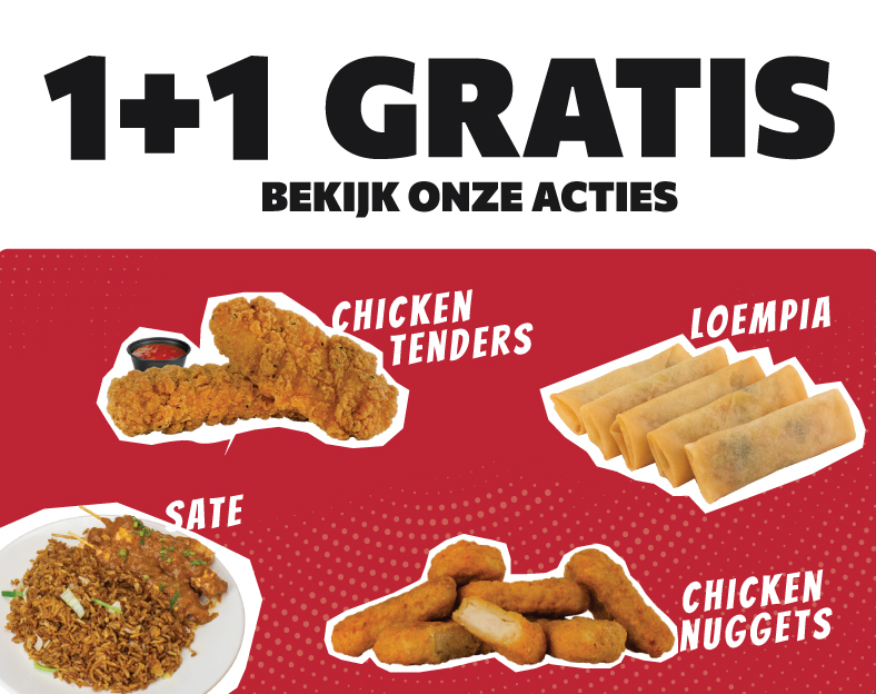 Bij Happy Surinees hebben we een heerlijke 1+1 gratis actie speciaal voor onze saté, chicken nuggets, chicken tenders en mini loempia’s. Bestel één portie en krijg de tweede gratis, zodat je dubbel zoveel kunt genieten van deze heerlijke lekkernijen. Trakteer jezelf en een vriend, en maak je bestelling extra bijzonder met deze tijdelijke actie.