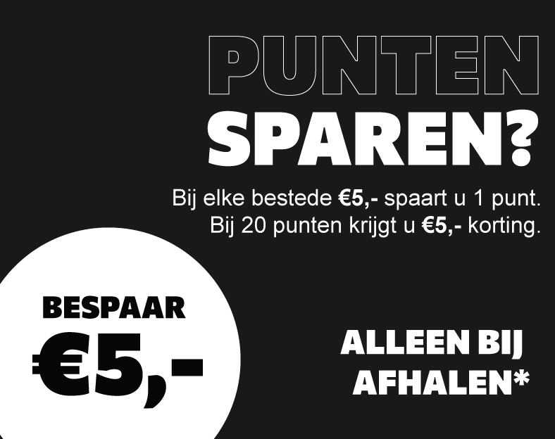 Bij Happy Surinees belonen we jouw bestellingen! Bij elke €5 die je besteedt, spaar je 1 punt. Verzamel 20 punten en ontvang €5 korting op je volgende bestelling. Zo wordt elke afhaalbestelling extra leuk en voordelig!